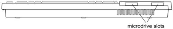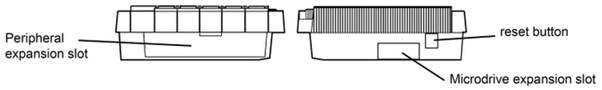 On the right-hand end of the QL there is a slot covered by a plastic strip. This slot is for attaching up to six more QL Microdrives. ZX Microdrives are not suitable for use with the QL but blank Microdrive cartridges can be used on either machine.