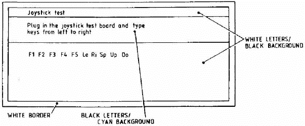 3.7.2 Ignore the message concerning the joystick test board (intended for factory use only). Instead press the F1, F2, F3, F4 and F5 keys on the keyboard followed by the Left, Right, Space, Up and Down keys on the keyboard. The background colour of each key on the display should change from blue to green as in the keyboard test. On pressing the last key the message 'joystick test complete' is displayed momentarily.