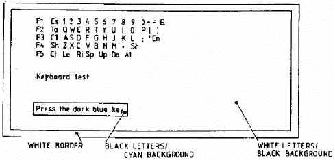 3.6.2 Press the key indicated by a dark blue background on the display. The blue background should be replaced by green and move onto the next key. Press all keys in sequence and note that on pressing the ALT key the message: 'keyboard test complete' is displayed momentarily.
